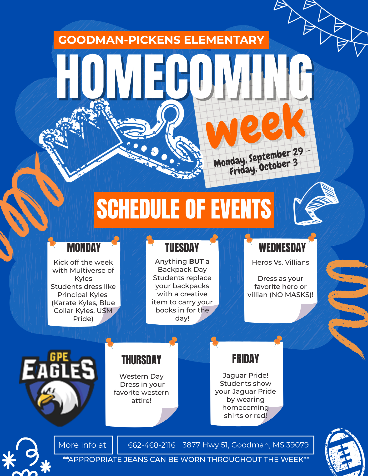 During Spirit Week, GPE will celebrate homecoming with our high school each day. Students will have the opportunity to dress in a fun way beginning Monday, September 29 through Friday, October 3rd. Please click here to see the schedule.